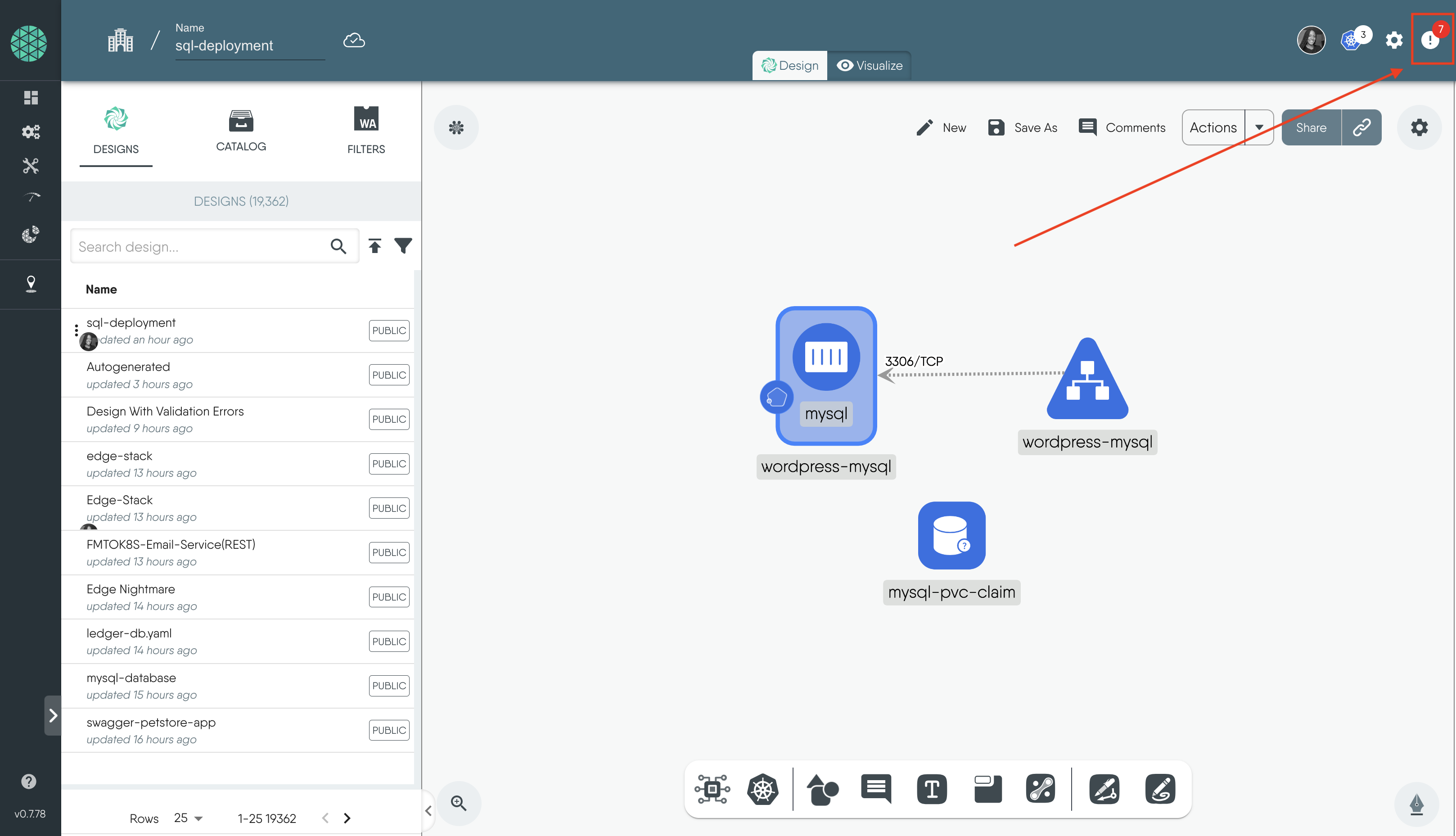 1. To deploy a design, navigate to the Actions button at the top of the Design canvas.